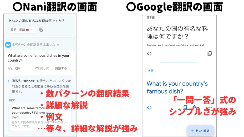 例えば、Nani翻訳とGoogle翻訳を、実際の操作画面で比較してみると……