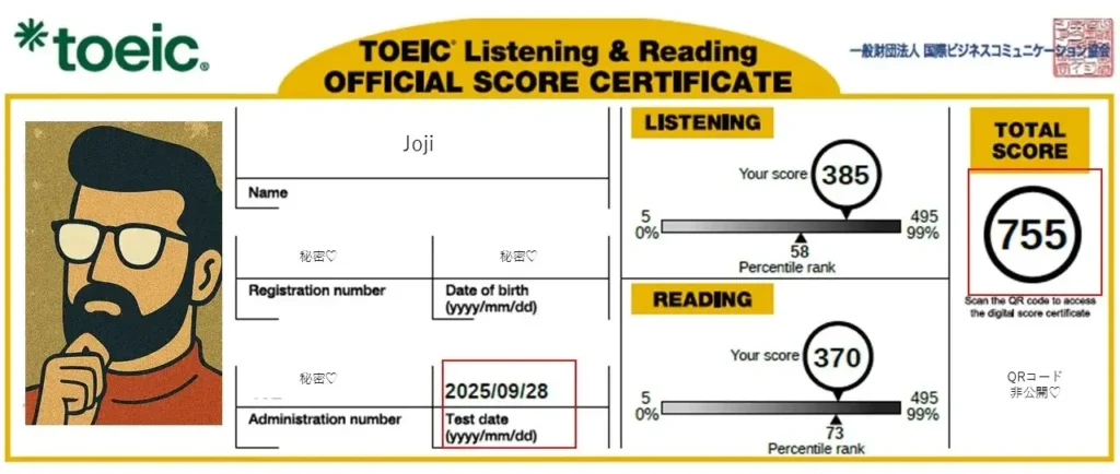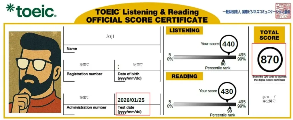 ※画像はプライバシー保護のため、氏名・顔写真・シリアル番号・生年月日・QRコードを加工していますが、スコア数値自体は事実に基づいています。