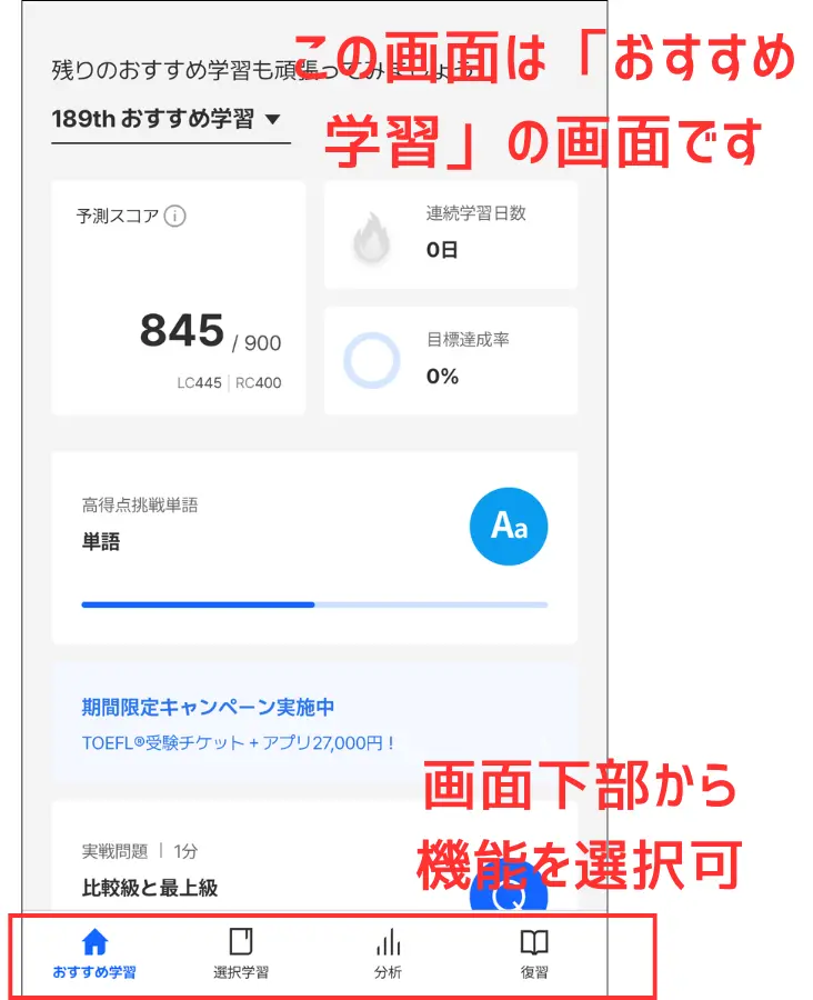 まずは3つの学習機能「おすすめ学習」「選択学習」「分析」を覚えておいてください